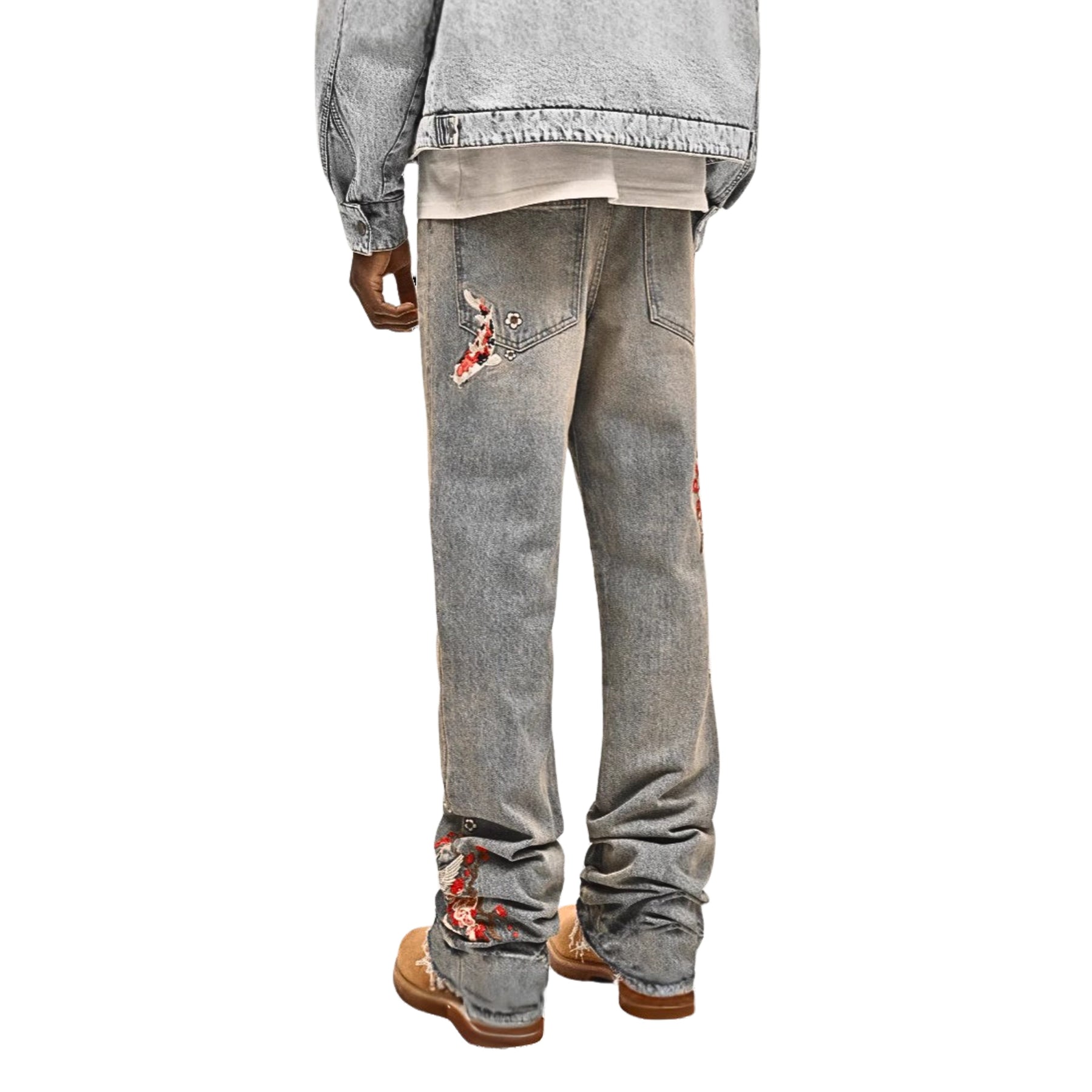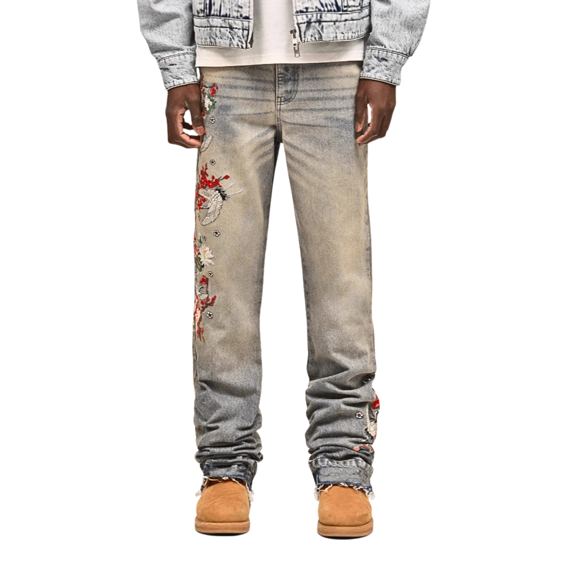 UNLOCK YOUR DRIP. These vintage wash jeans have detailed floral embroidery with birds running down the leg. They’ve got a bold look but still feel easy to wear. A clean piece that makes your fit stand out without trying too hard.